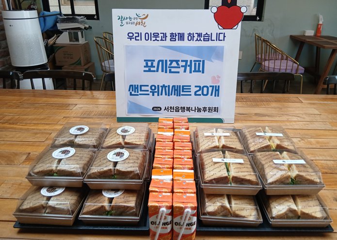 [충청25시] 서천읍 포시즌커피 김유리 대표는 지난 25일 지역아동을 위한 샌드위치와 음료 20세트를 서천읍행복나눔후원회에 후원했다.