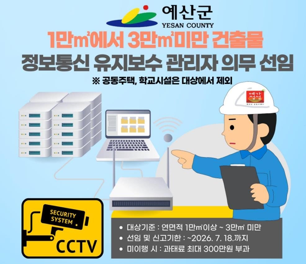 [충청25시] 예산군은 대형 건축물의 정보통신설비 장애를 예방하고 안정적인 운영을 도모하기 위해 ‘정보통신설비 유지보수 관리자 선임제’를 시행하고 대상 확대에 나선다.