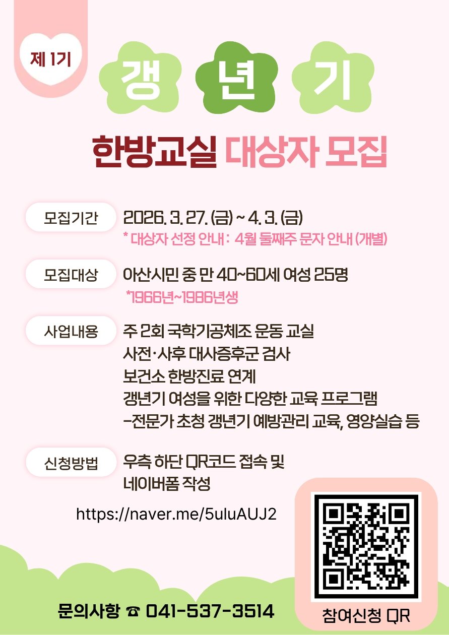 [충청25시] 아산시보건소에서 갱년기 예방 및 건강관리를 지원하기 위해 ‘제1기 갱년기 생기가득 한방교실’ 참여자를 3월 27일부터 4월 3일까지 모집한다.