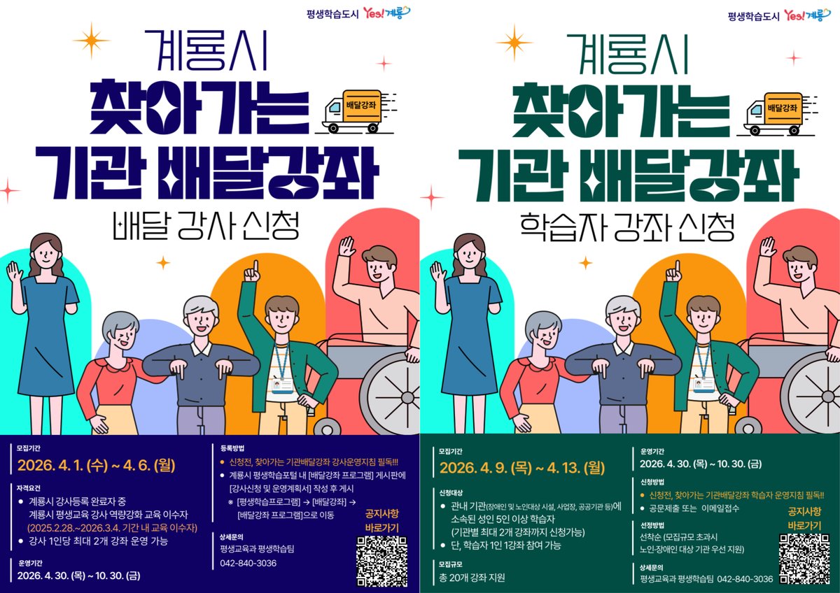 [충청25시] 충남 계룡시는 ‘2026년 찾아가는 기관 배달강좌’ 운영을 위해 강사와 학습자를 공개 모집한다고 밝혔다.