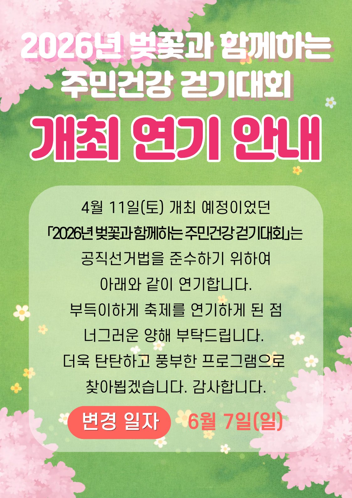 [충청25시] 홍성군 광천읍과 광천읍주민자치회는 당초 11일 광천읍 하상주차장에서 개최할 예정이었던 ‘2026년 벚꽃과 함께하는 주민건강 걷기대회’행사를 6월 7일로 연기한다고 밝혔다.
