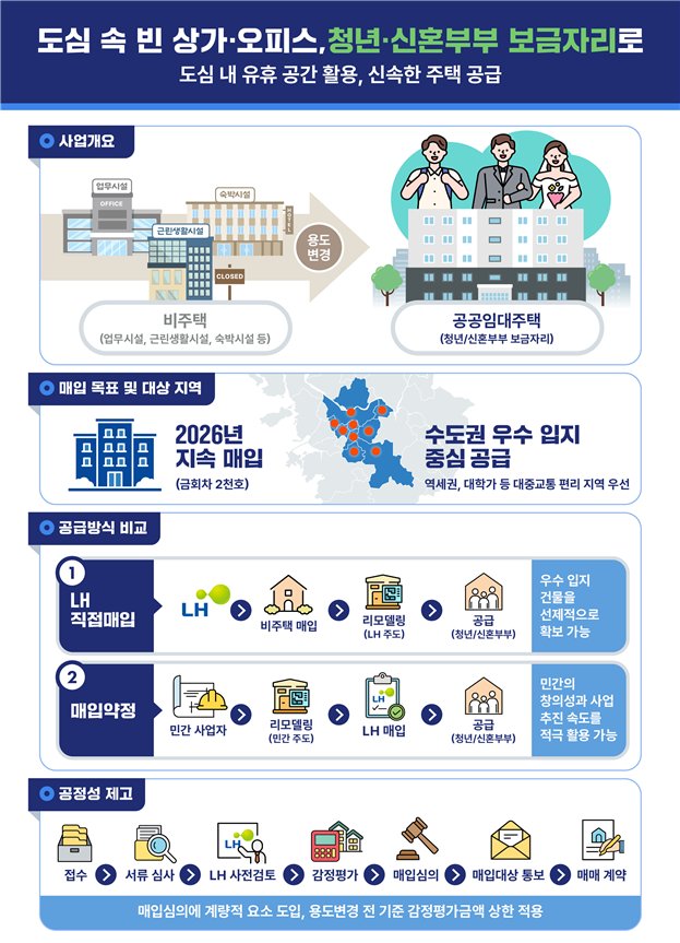 이번 사업 매입 대상은 주택공급이 시급한 주요 지역에 있는 근린생활시설, 업무시설, 숙박시설 등으로 용도변경을 수반해 주거용 전환이 가능한 건축물이다.