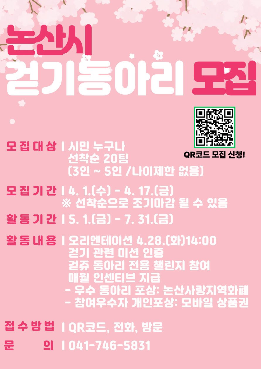 참여자에게는 걷기용품이 제공되며 활동 실적에 따라 우수 동아리에는 최대 10만원 상당의 논산사랑상품권이 지급된다.