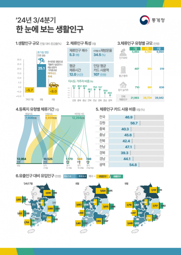 9월 기준 체류인구는 약 2천 604만명, 등록인구는 약 490만명으로 나타났다.