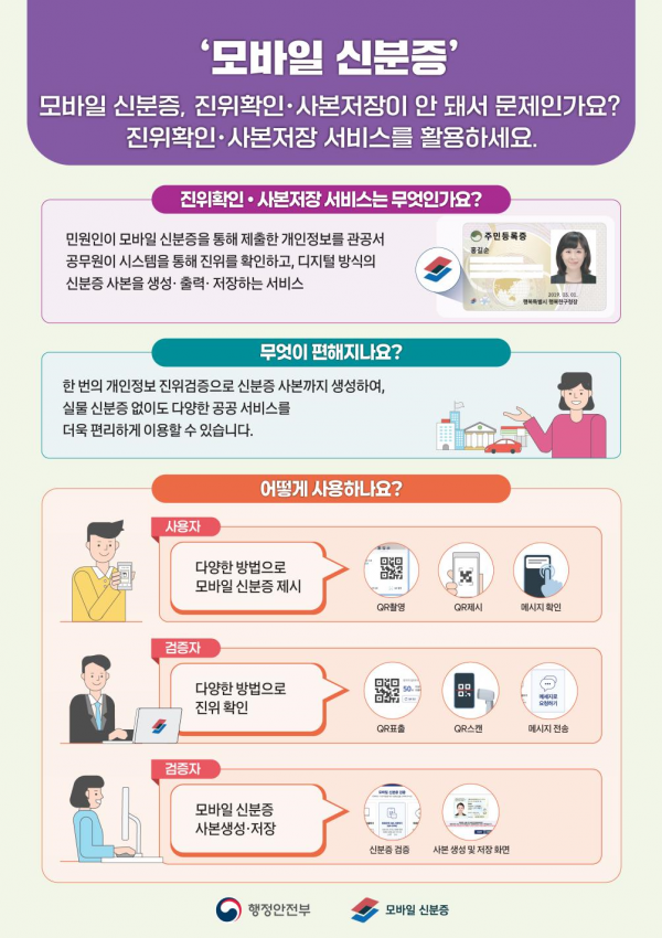 행정안전부는 이러한 불편을 해소하고자 ‘진위확인·사본저장 서비스’를 도입해 모바일 신분증을 실물 신분증처럼 활용할 수 있도록 개선한다.
