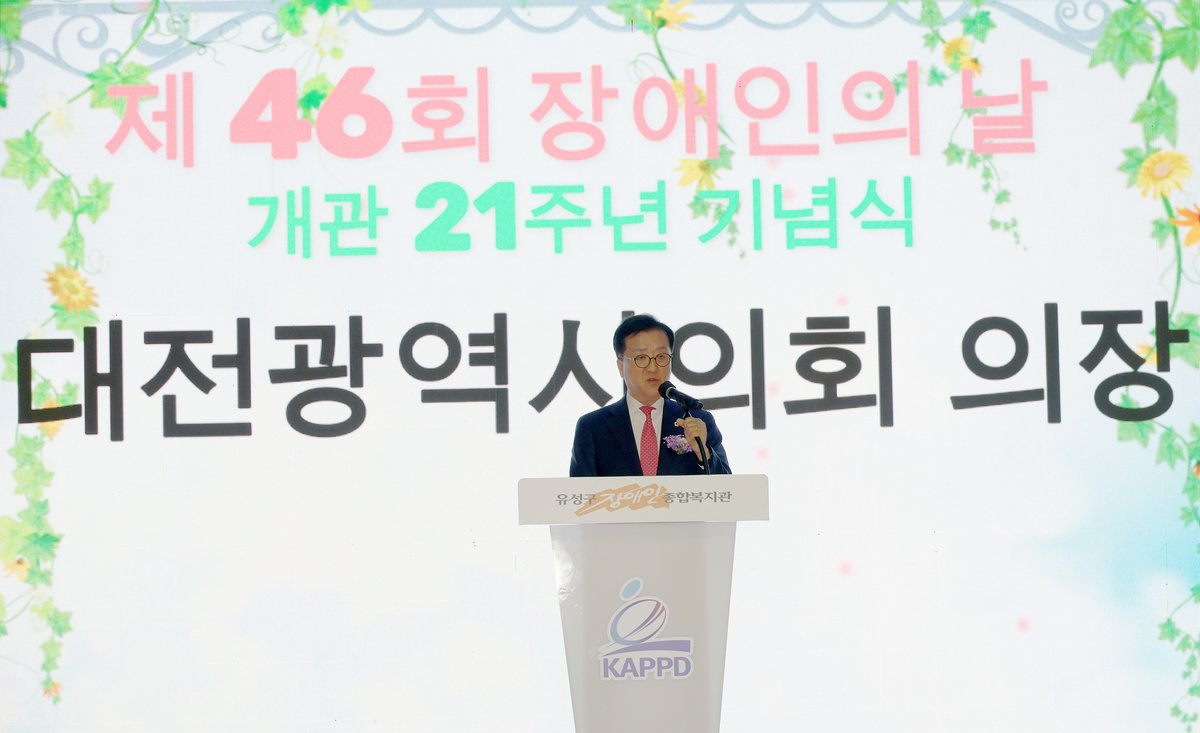 [충청25시] 대전시의회 조원휘 의장은 9일 제46회 장애인의 날 및 유성구장애인종합복지관 21주년 기념식에 참석해 장애에 대한 편견을 허물고 지역 공동체의 결속을 다지는 계기를 마련했다.