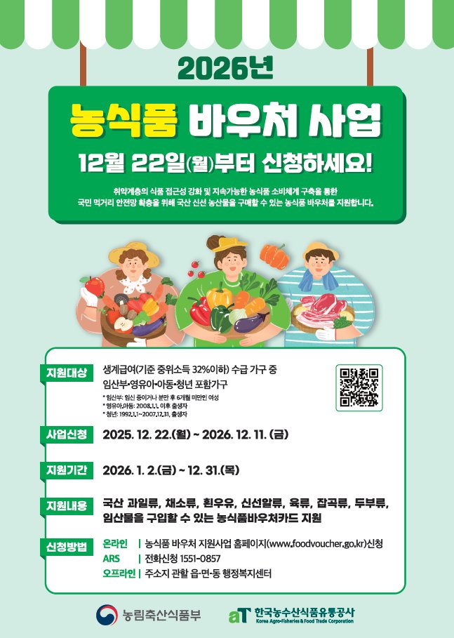 군 관계자는 “농식품 바우처 사업은 취약계층의 먹거리 기본권을 보장하는 동시에 국내산 신선 농산물 소비를 확대하는 정책”이라며 “지원 대상 가구가 빠짐없이 혜택을 받을 수 있도록 적극적인 홍보와 세심한 사업 추진에 최선을 다하겠다”고 말했다.