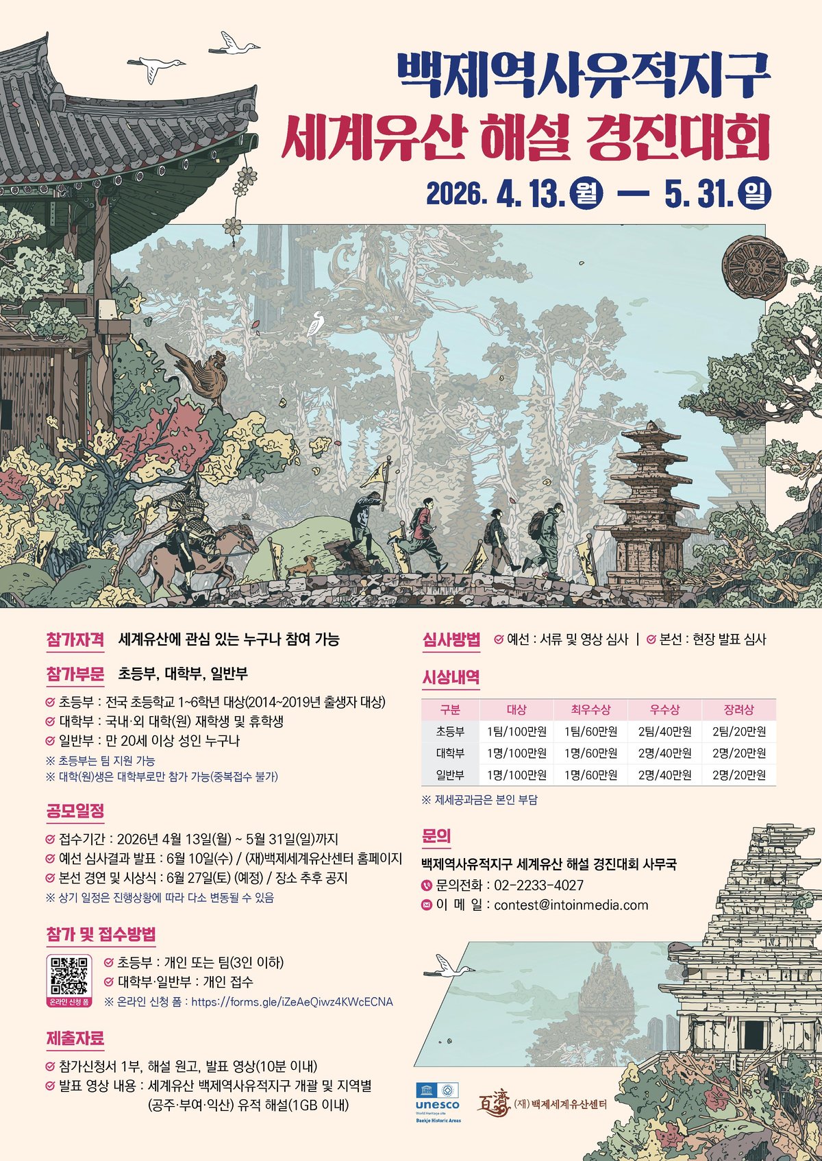 참가 신청은 온라인 접수를 통해 가능하며 자세한 사항은 (재)백제세계유산센터 누리집 h 또는 공모전 운영사무국으로 문의하면 된다.