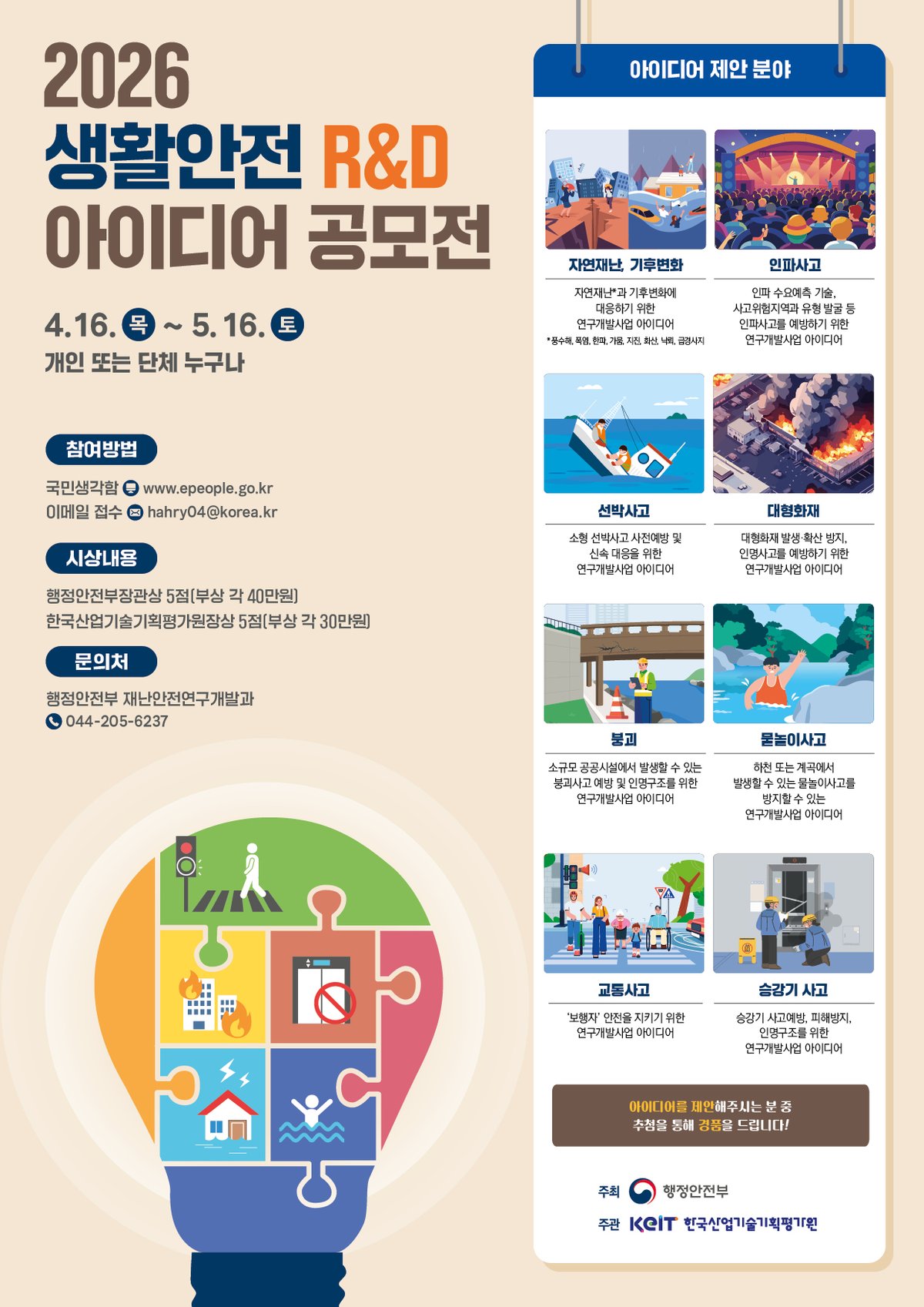 [충청25시] 행정안전부는 4월 16일부터 5월 16일까지 ‘2026년 생활안전 R&D 아이디어 공모전’을 실시한다.