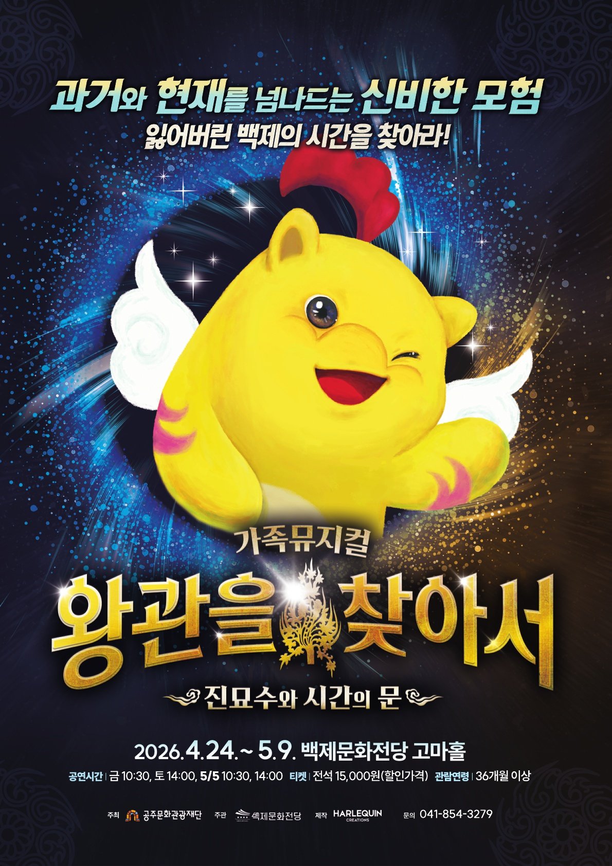 [충청25시] 백제문화전당이 오는 4월 24일부터 5월 9일까지 어린이 뮤지컬 전문 제작사 할리퀸크리에이션즈와 손잡고 참여형 에듀테인먼트 가족극 ‘왕관을 찾아서: 진묘수와 시간의 문’을 선보인다.