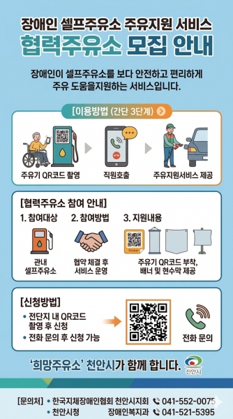 [충청25시] 천안시가 장애인의 셀프주유소 이용 불편을 해소하기 위해 ‘장애인 편의 제공 셀프주유소’ 참여 업체를 모집한다고 24일 밝혔다.
