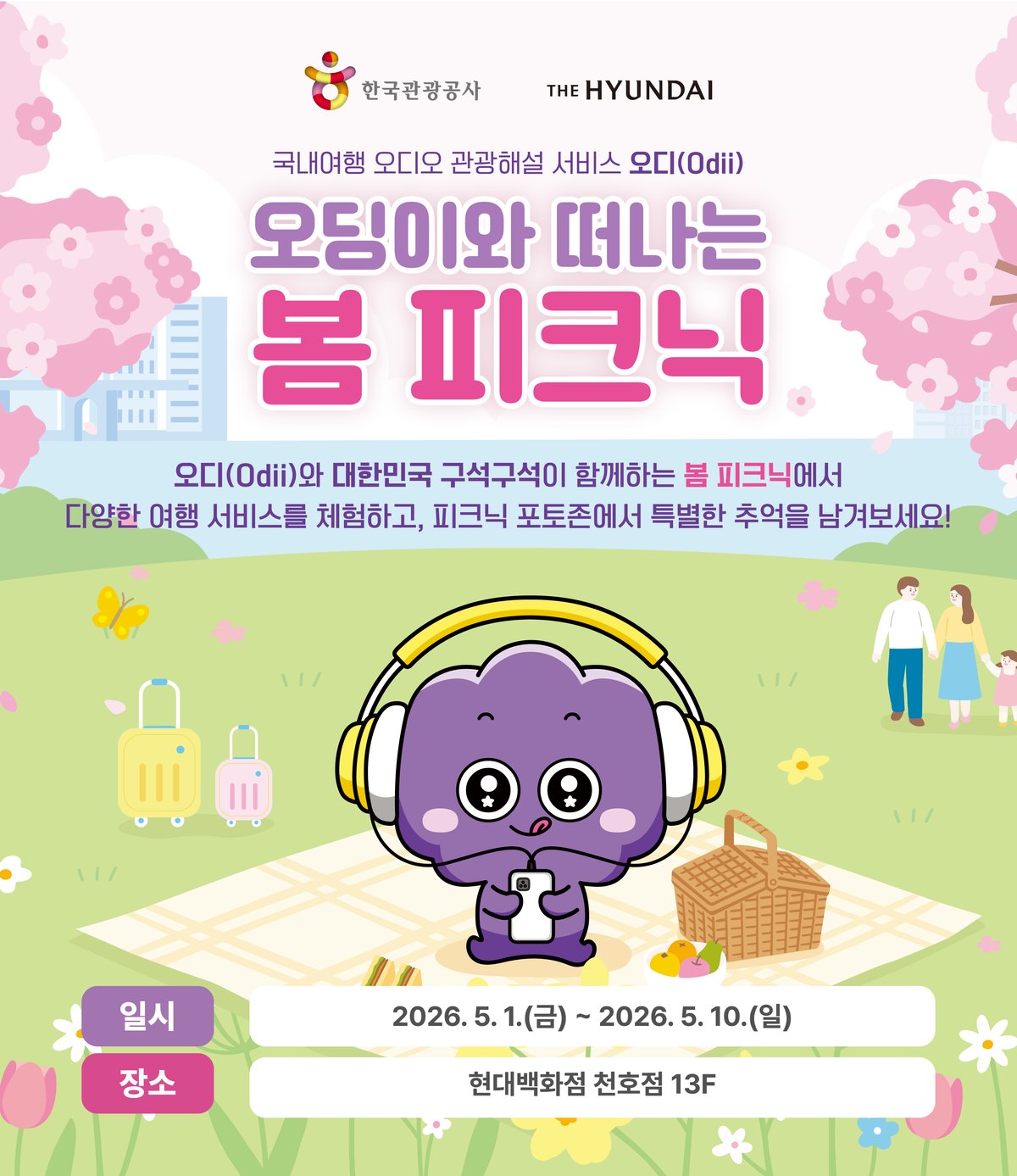 [충청25시] 한국관광공사는 현대백화점 천호점과 업무협약을 맺고 5월 1일부터 10일까지 천호점 13층에서 ‘오딩이와 떠나는 봄 피크닉’팝업스토어를 운영한다.