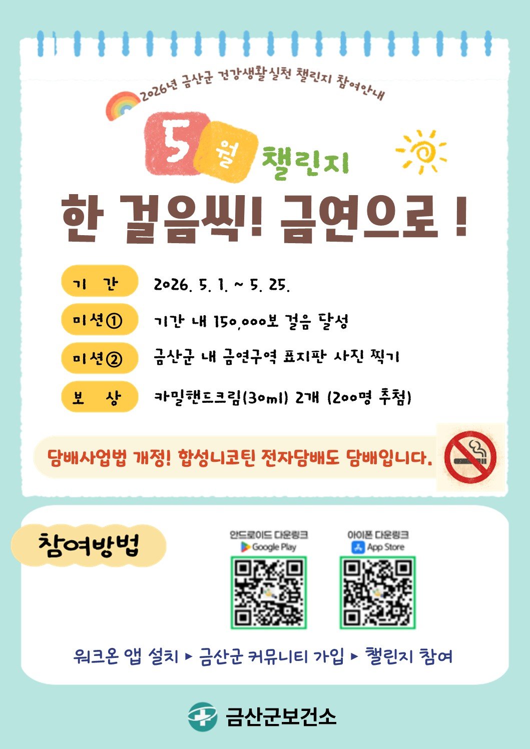 [충청25시] 금산군보건소는 지역주민의 건강증진과 금연 실천 분위기 확산을 위해 오는 2026건강생활실천 5월 챌린지 ‘한 걸음씩 금연으로’를 5월 1일부터 25일까지 진행한다.