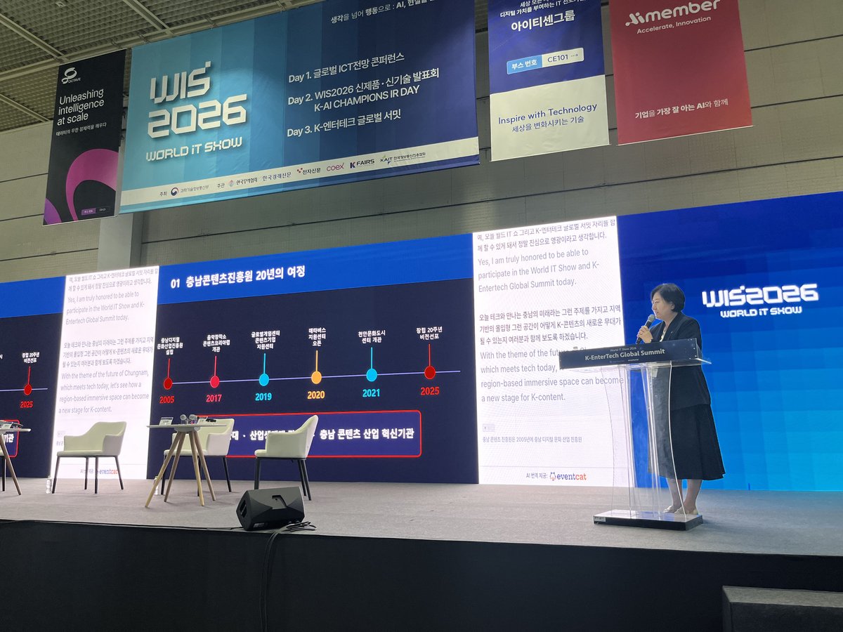 김곡미 충남콘텐츠진흥원장은 “이번 월드 IT 쇼 2026 참가를 통해 충남 엔터테크 기업들의 기술력과 시장 경쟁력을 확인할 수 있었다”며 “앞으로도 지역 기업의 지속적인 성장을 위해 다양한 지원을 아끼지 않겠다”고 밝혔다.
