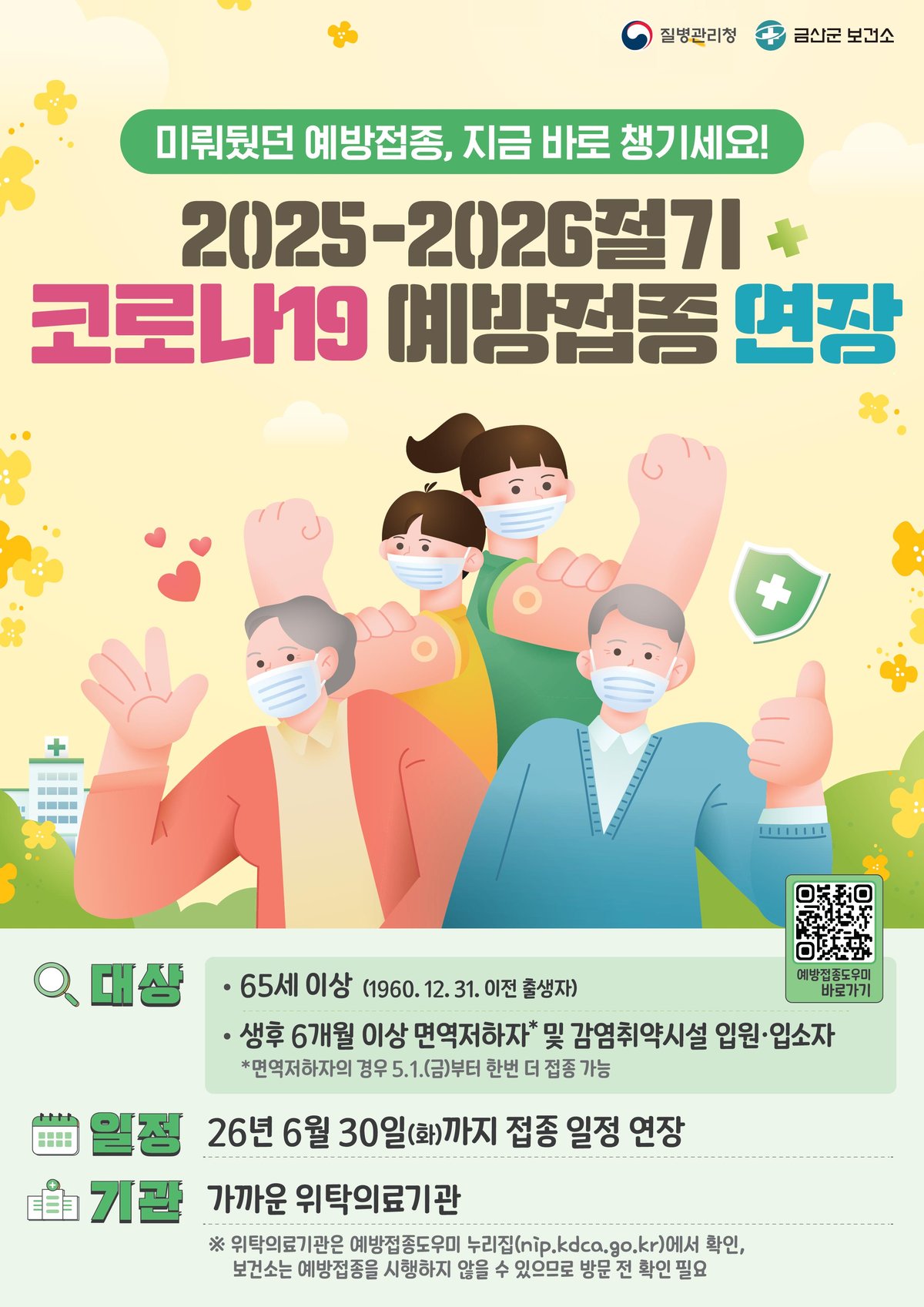 [충청25시] 금산군은 군민의 감염병 예방을 통한 군민 건강을 지키기 위해 당초 4월 30일 종료 예정이었던 2025-2026절기 코로나19 예방접종 기간이 오는 6월 30일까지 두 달간 연장된 사살에 대한 안내에 나섰다.