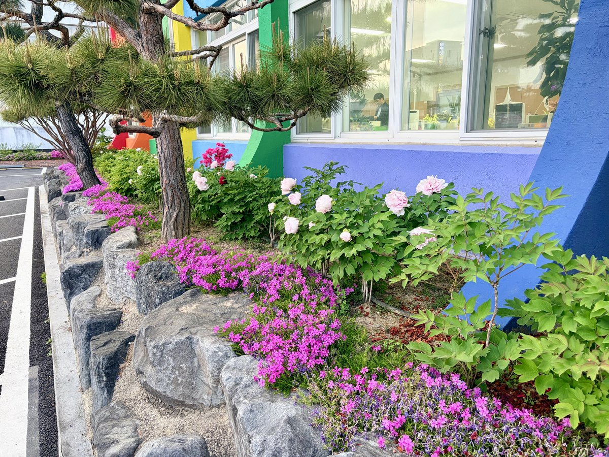 영산홍과 모란이 차례로 만개하며 화사한 봄의 정취를 완성하고 있으며 선명한 붉은빛과 분홍빛 꽃들은 행정복지센터 건물 외관과 자연스럽게 어우러져 한층 생동감 있는 분위기를 연출한다.