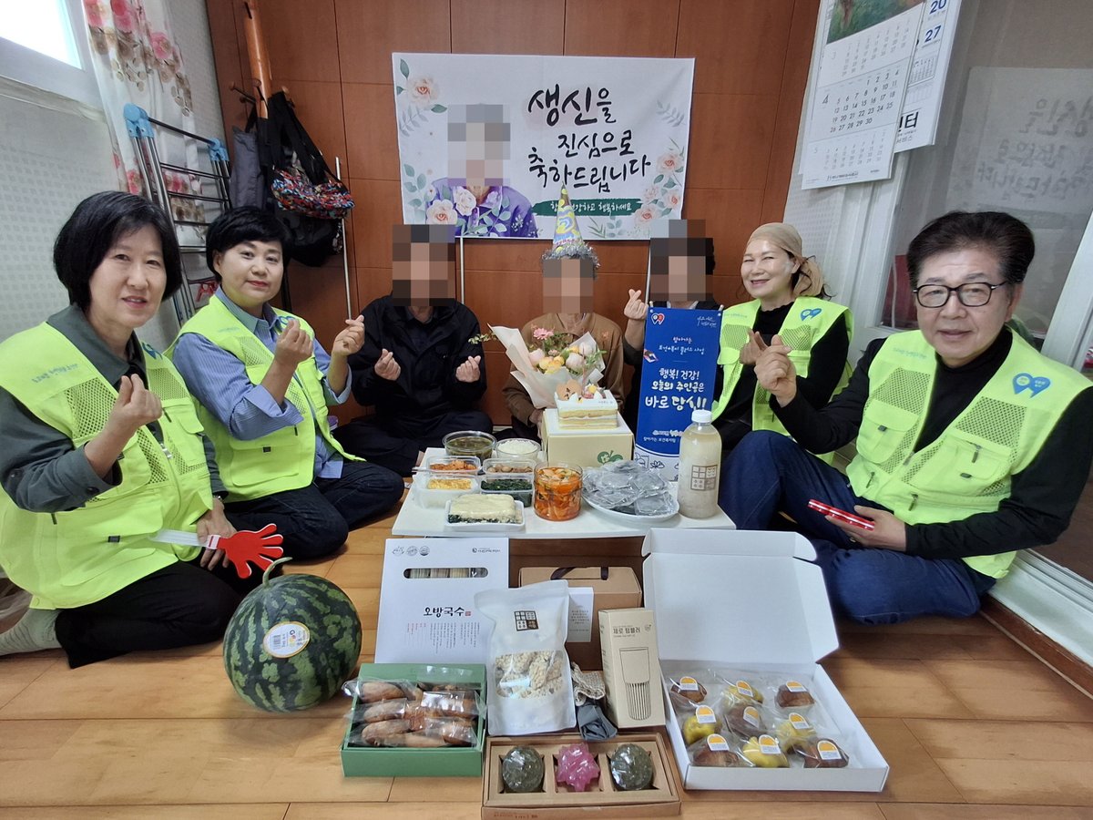 생신상에는 정미경 단장·여순남 단원이 준비한 미역국·밥·떡·물김치, 이진용 시전4리 이장이 준비한 수박, 김진회 도고면장이 직접 만든 반찬 4종이 올랐다.