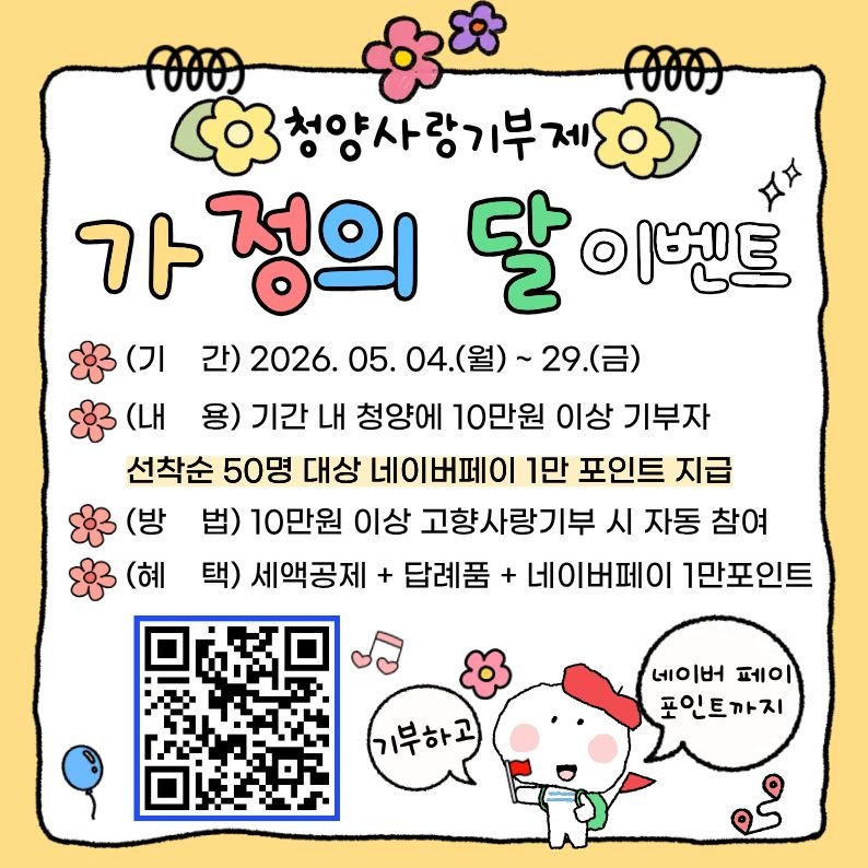 이벤트 참여 대상은 기간 중 청양군에 10만원 이상 기부한 사람이며 선착순 50명에게 네이버페이 1만 포인트를 추가로 지급한다.