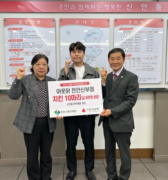 [충청25시] 천안시 신안동은 지난 9일 아웃닭 천안신부점이 치킨 10마리를 기탁했다고 밝혔다.