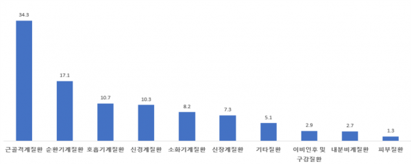 주로 발생하는 질병은 근골격계 질환이 34.3%로 가장 많았으며 근골격계 질환이 발생한 주요 신체 부위는 어깨가 가장 많았고 허리, 무릎이 뒤를 이었다.
