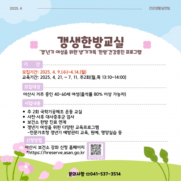 [충청25시] 아산시가 갱년기 예방과 건강 관리를 위해 ‘제1기 갱년기 생기가득 한방교실’ 참여자를 오는 14일까지 모집한다.