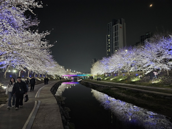 [충청25시] 천안시는 벚꽃 개화 시기에 맞춰 원성천과 천안천 산책로에 야간 ‘벚꽃 조명’을 가동한다고 11일 밝혔다.