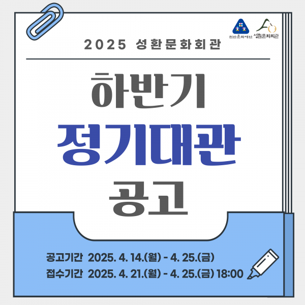[충청25시] 천안문화재단은 오는 4월 21~ 25일 성환문화회관 대·소공연장 하반기 정기대관 공모 접수를 받는다고 11일 밝혔다.