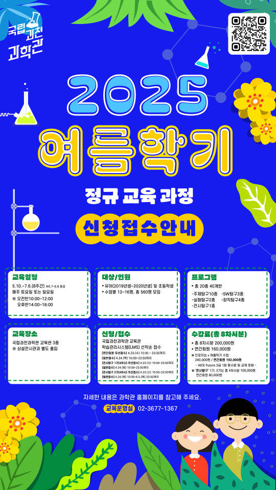 여름학기 개인 정규교육과정은 4월 24일부터 국립과천과학관 교육관 온라인 학습관리체계에서 신청할 수 있으며 자세한 내용은 국립과천과학관 누리집에서 확인할 수 있다.