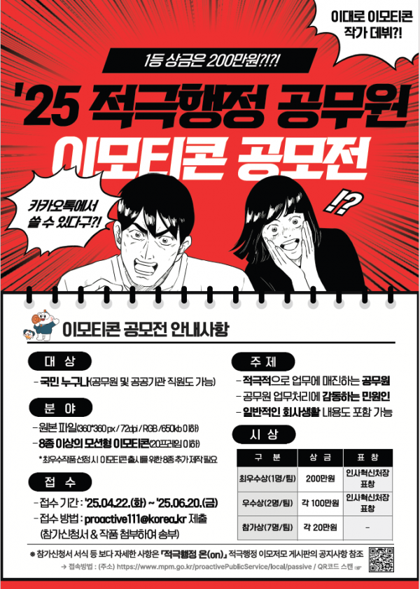 인사혁신처는 ‘25년 적극행정 공무원 그림말 공모전’을 개최하고 오는 6월 20일까지 출품작품을 접수한다고 22일 밝혔다.