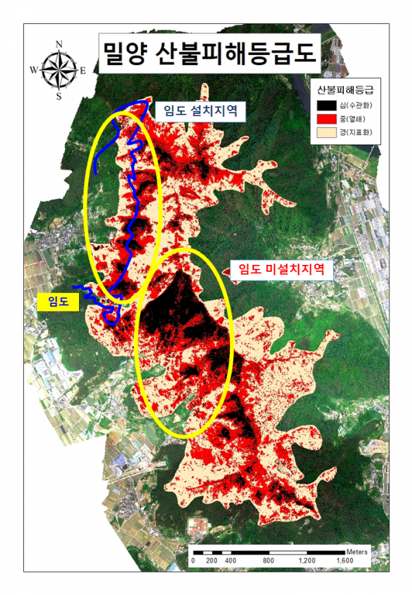 예로 2022년 밀양 산불의 피해 정도를 살펴보면 임도가 설치된 북서쪽 지역의 피해는 적은 반면 임도가 없는 중앙부나 남쪽 지역의 경우 피해가 더 넓고 피해 정도도 큰 것을 확인할 수 있다.