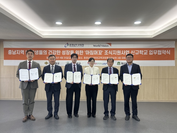 [충청25시] 충남교육청은 25일 월드비전 대전세종충남 사업본부와 신규 학교 4교와 함께 조식지원사업 ‘아침머꼬’ 업무협약을 체결했다고 밝혔다.