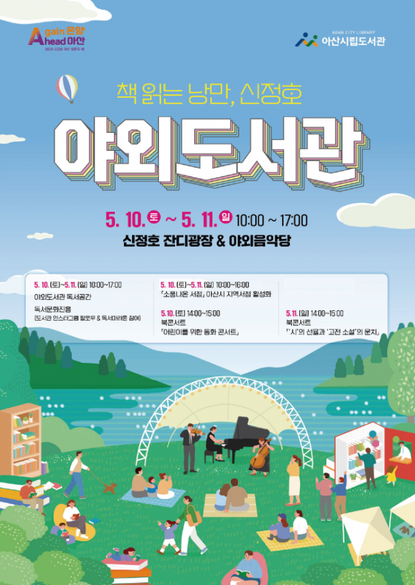 [충청25시] 아산시가 ‘2025~2026 충남 아산 방문의 해’를 맞아, 오는 5월 10일 토요일부터 5월 11일 일요일까지 신정호에서 ‘책 읽는 낭만, 신정호 야외도서관’을 운영한다.