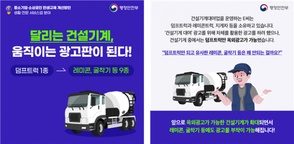 이에 행정안전부는 다른 건설기계와의 형평성을 고려, 자동차손해배상보장법상 책임보험 가입으로 도로 주행이 가능한 굴착기 등 다른 건설기계를 자기광고 가능 건설기계로 포함해 자기광고 허용 범위를 총 9종으로 확대했다.