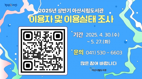 [충청25시] 아산시가 관내 도서관 이용자를 대상으로 ‘이용실태 및 서비스 만족도 조사’를 4월 30일부터 5월 27일까지 실시한다.