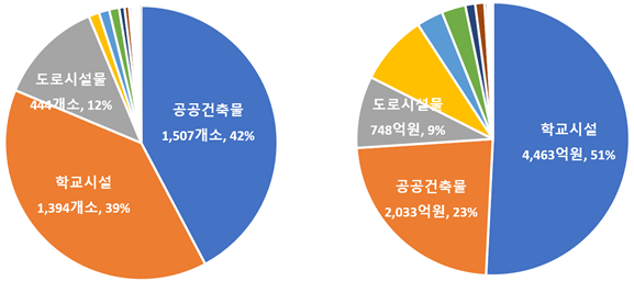 시설물별로는 공공건축물과 학교시설이 실적이 많았으며 도로시설물이 그 뒤를 이었다.