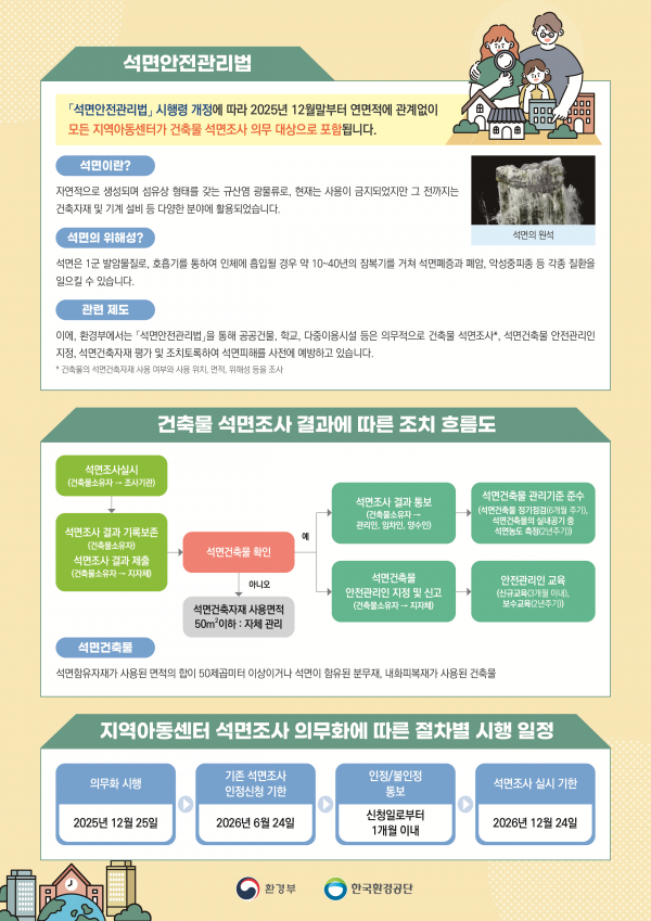 이에 따라 소규모 시설을 포함하는 전국의 모든 지역아동센터는 올해 12월 25일부터 1년 이내에 석면조사를 실시하고 그 결과를 기록·보존해야 한다.