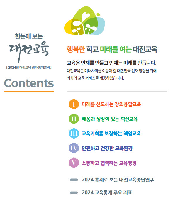 한눈에 쏙: 자료 구성 시, 과제별 주요 통계자료를 한눈에 볼 수 있도록 표 또는 그래프로 시각화해 제시하는 부분을 일컬음.또한, 2024년에 수행한 제1차 대전교육종단연구 교사용 데이터 분석 결과를 수록하고 한국교육개발원에서 발표한 2024년 교육통계 주요 지표를 포함해 대전교육 현황을 알리고자 했다.