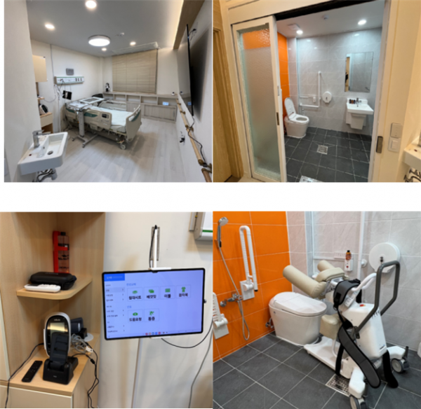 병실환경과 유사하게 간호사 호출 시스템을 설치했으며 사용자와 돌봄자에게 필요한 낙상 및 자세변환 감지가 가능한 모니터링 센서 체중 모니터링이 가능한 전동침대, 별도의 슬링이나 레일 등의 제한 없이 자유로운 범위로 이동이 가능한 이승기기 등의 돌봄기기를 배치했다.