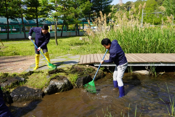 이번 환경정화 활동에는 공단 임직원 20명이 참여해 공원 내 계류에 쌓인 부유 쓰레기와 이끼를 집중적으로 수거하며 쾌적한 환경 조성에 힘썼다.