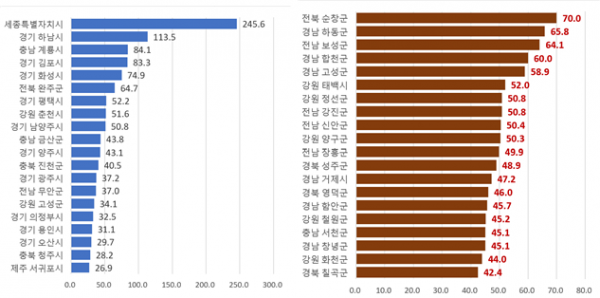 비수도권 중에서 취업자가 증가한 상위 도시는 행정수도와 혁신도시, 수도권에 인접한 충북, 충남의 산업도시들로 확인됐다.