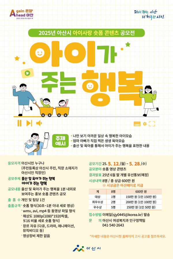 [충청25시] 아산시는 저출산 극복과 출산 친화적 사회 분위기 조성을 위해 ‘2025년 아산시 아이사랑 숏폼 콘텐츠 공모전’을 개최한다고 12일 밝혔다.