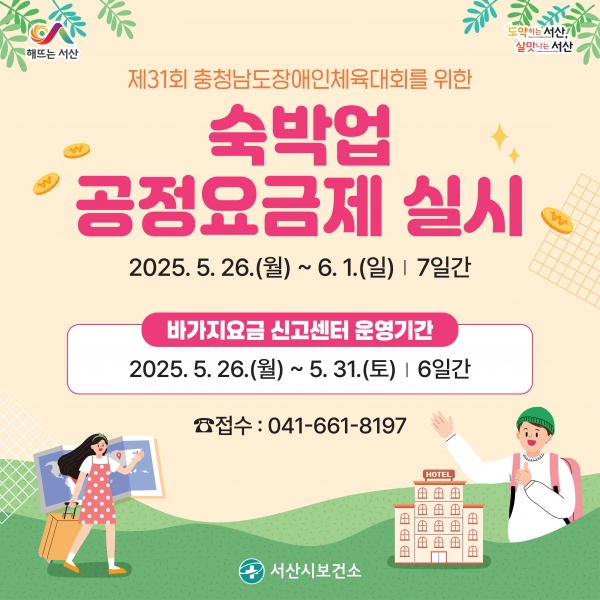 [충청25시] 충남 서산시는 제31회 충청남도장애인체육대회 기간 숙박업소 바가지요금 근절을 위해 5월 26일부터 6월 1일까지 숙박업 공정요금제를 운영한다고 밝혔다.