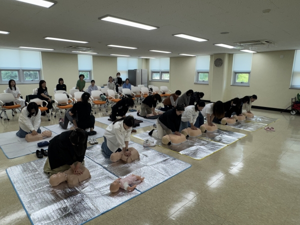 이어지는 실습 과정에서는 심폐소생술 실습, 자동심장충격기 사용법, 기도 폐쇄 응급처치 등을 실제 장비를 활용해 반복적으로 훈련함으로써 현장에서의 즉각적 대응 능력을 강화할 수 있도록 한다.