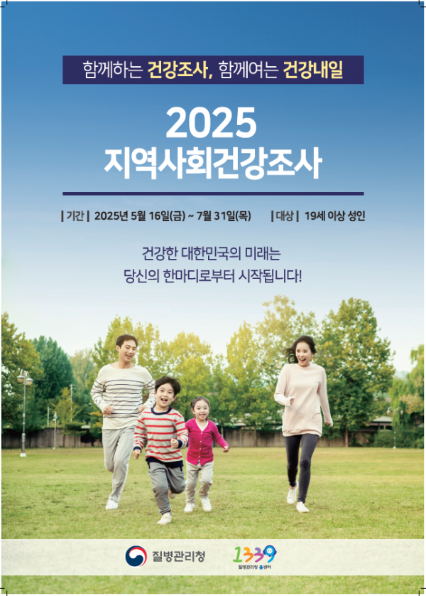 [충청25시] 질병관리청은 5월 16일부터 7월 31일까지 전국 17개 광역자치단체 및 258개 보건소와 함께 ‘2025년 지역사회건강조사’를 실시한다.