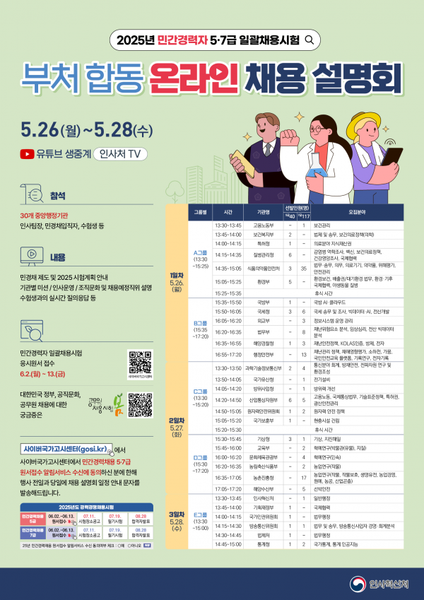 인사혁신처는 오는 26일부터 28일까지 사흘간 ‘2025년도 국가공무원 5급 및 7급 민간경력자 일괄채용시험 부처 합동 온라인 채용설명회’를 연다고 19일 밝혔다.
