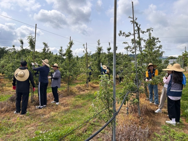 이번 활동은 일손이 부족한 농촌 현장을 직접 찾아가 도울 수 있는 뜻깊은 자리로 직원들은 아침부터 열매를 솎아내는 ‘적과’ 작업에 집중했다.