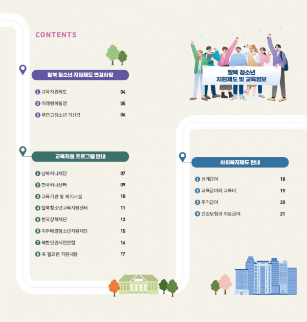 본 안내서는 탈북 청소년의 정착과 진로 설계에 실질적인 도움을 주는 안내 자료로 최신 제도 개정사항을 반영해 필요한 정보를 한눈에 파악할 수 있도록 구성됐다.