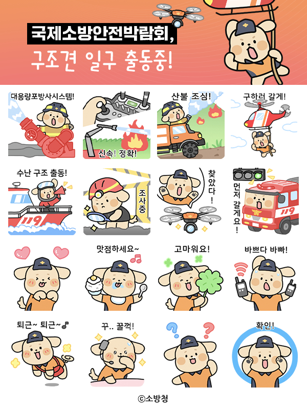 총 16종으로 구성된 이모티콘은 대용량포방사시스템, 무인파괴방수차, 다목적 산불진화차, 119소방헬기, 119수상구조대, 드론, 긴급차량우선신호시스템 등 첨단 장비·기술을 활용해 재난을 대응하는 모습을 담은 8종과 일상 속에서 유용하게 사용할 수 있는 상황 및 감정 표현 이모티콘 8종으로 구성되어 있다.