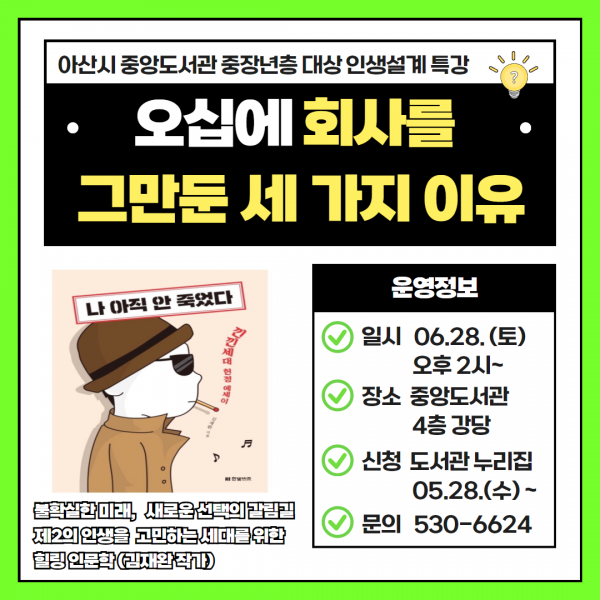 [충청25시] 아산시립도서관이 오는 6월 28일 오후 2시, 중앙도서관 강당에서 중장년층을 대상으로 인생 설계 특강 ‘오십에 회사를 그만둔 세 가지 이유’를 운영한다.