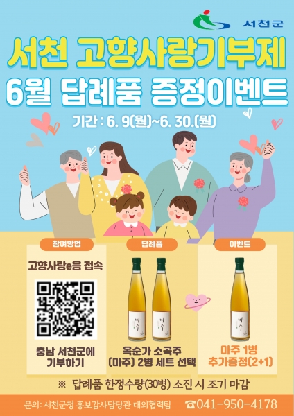 이충희 홍보감사담당관은 “이번 이벤트를 통해 고향사랑기부제 참여자들이 세액공제 혜택은 물론, 서천의 대표 전통주인 한산 소곡주를 답례품으로 받아볼 수 있길 바란다”며 많은 관심과 참여를 당부했다.